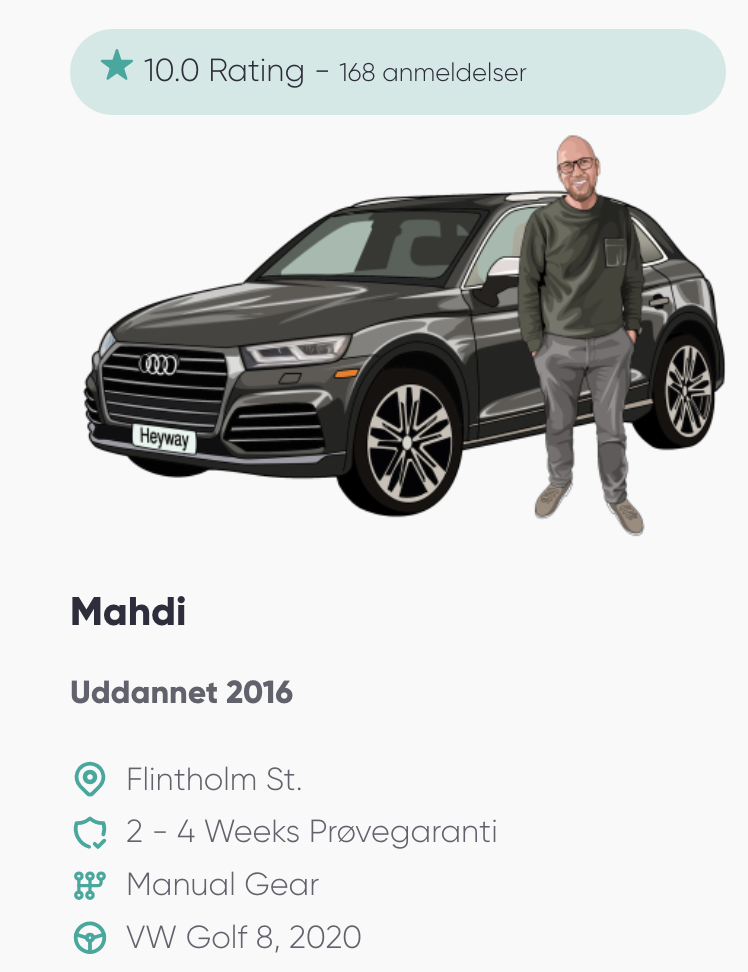 Godt koncept HeyWay køre med så meget fleksibilitet omkring hvilken Kørelære man ønsker. Bestået køreprøve første gang.