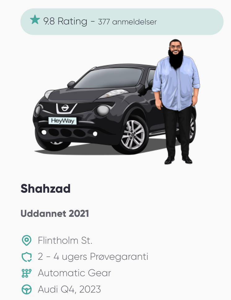 Super fedt koncept, meget fleksibelt i forhold til din egen hverdag, gode kørelærer og alt i alt bare skide godt. Kan kun anbefale HeyWay